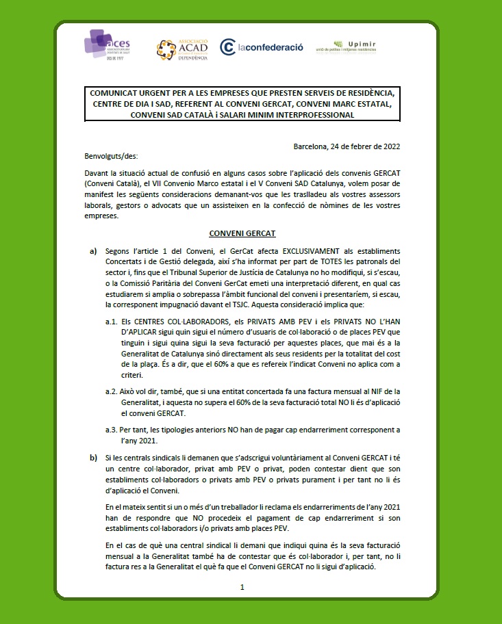 COMUNICAT CONJUNT URGENT PER A LES EMPRESES QUE PRESTEN SERVEIS DE RESIDÈNCIA, CENTRE DE DIA I SAD, REFERENT AL CONVENI GERCAT, CONVENI MARC ESTATAL, CONVENI SAD CATALÀ I SALARI MINIM INTERPROFESSIONAL